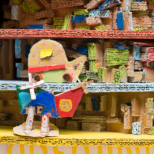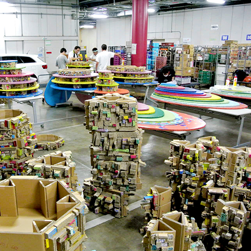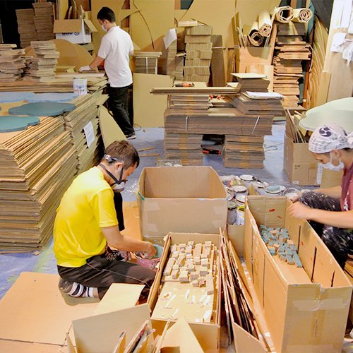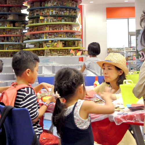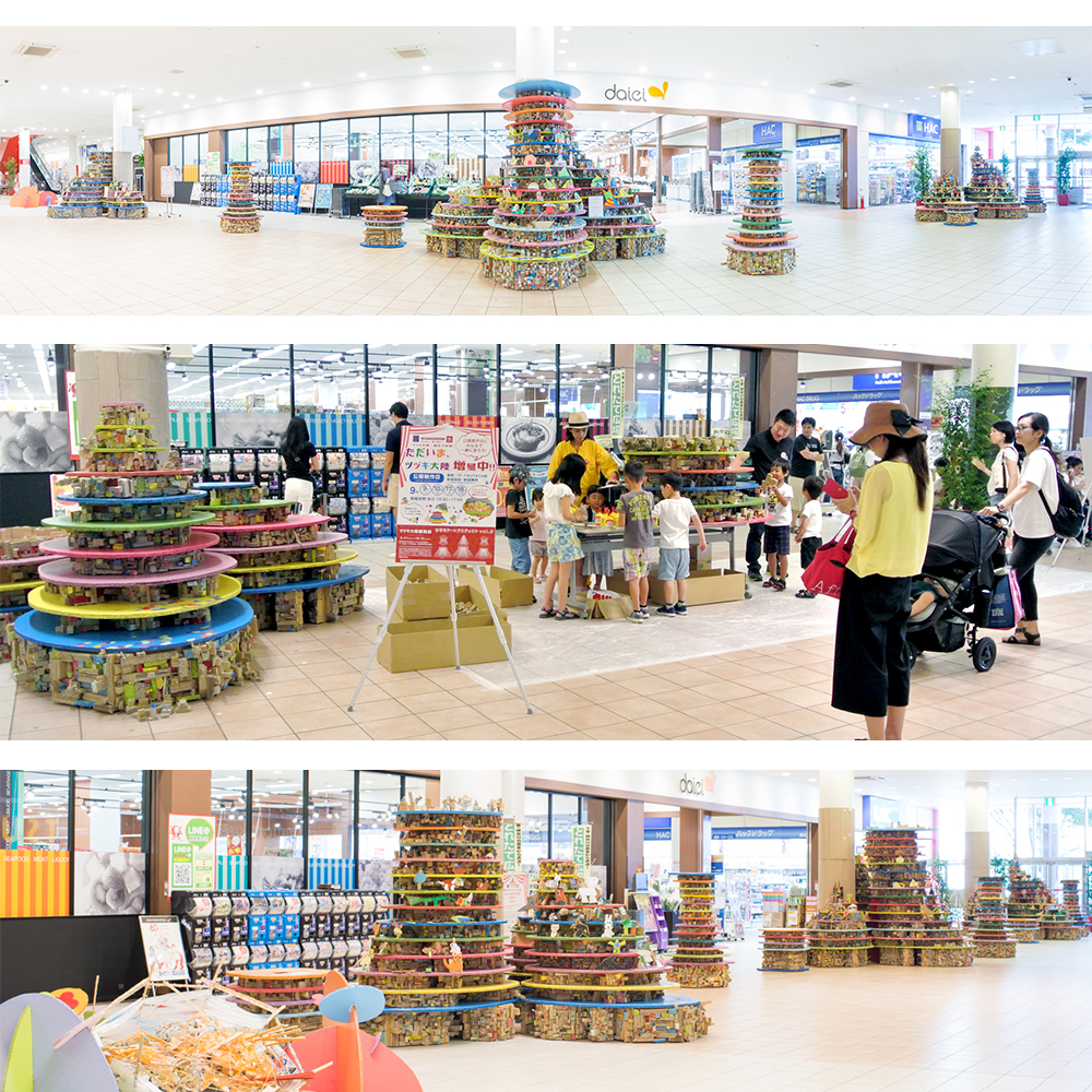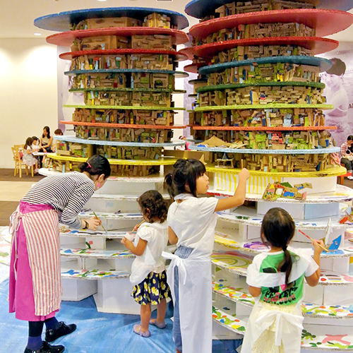 各方面で活躍する実際のアーティストと、子ども達と巨大アート作品を制作。大掛かりな作品制作に必要な場所や材料、人員の確保等、企画から実施まで全て行いました。突如現れた巨大アートに多くの来館者が足を止めて鑑賞しました。
